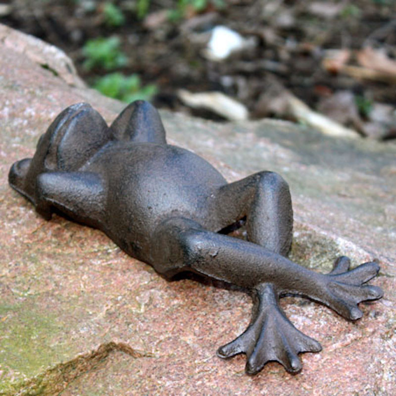 Groda av gjutjärn som ligger och solar sig, ca 20 cm lång.