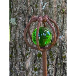 Växtstöd Vildmorot, ca 1 meter högt. Smidigt dekorativt växtstöd i rostigt gjutjärn med en korg som kapslar in en grön glaskula. Stödet har en vinkel och därmed dubbla pinnar nedtill så det är lätt att trampa ned i jorden och sitter dessutom bra.