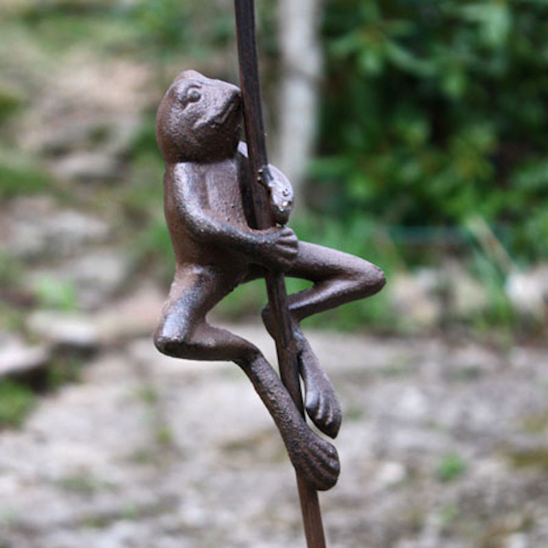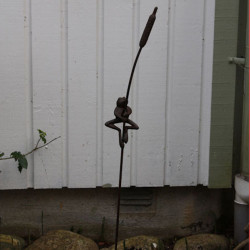 Växtstöd, groda på kaveldun, lite böjligt skaft ca 1 meter högt. Ett både roligt och vackert växtstöd med en groda som håller sig fast i ett kavelduns strå. Materialet är rostigt gjutjärn så grodan håller även om du lämnar den ute under vintern.